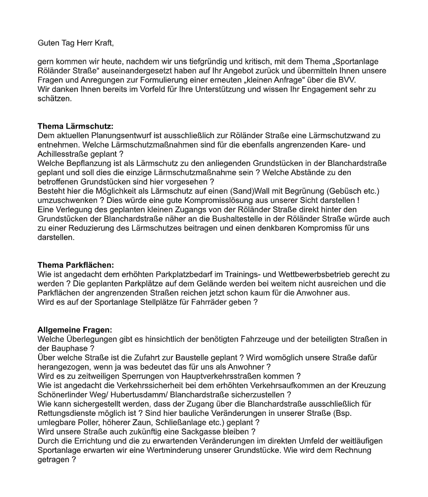 In unserem Vorortterminen am 28.6. auf dem Sportplatz sprach Herr Kraft von einem Zeitfenster bis Ende Juli, zu dem er unsere Fragen gern haben möchte, um die Anfrage gleich im September (nach der Sommerpause) in die BVV einzubringen.